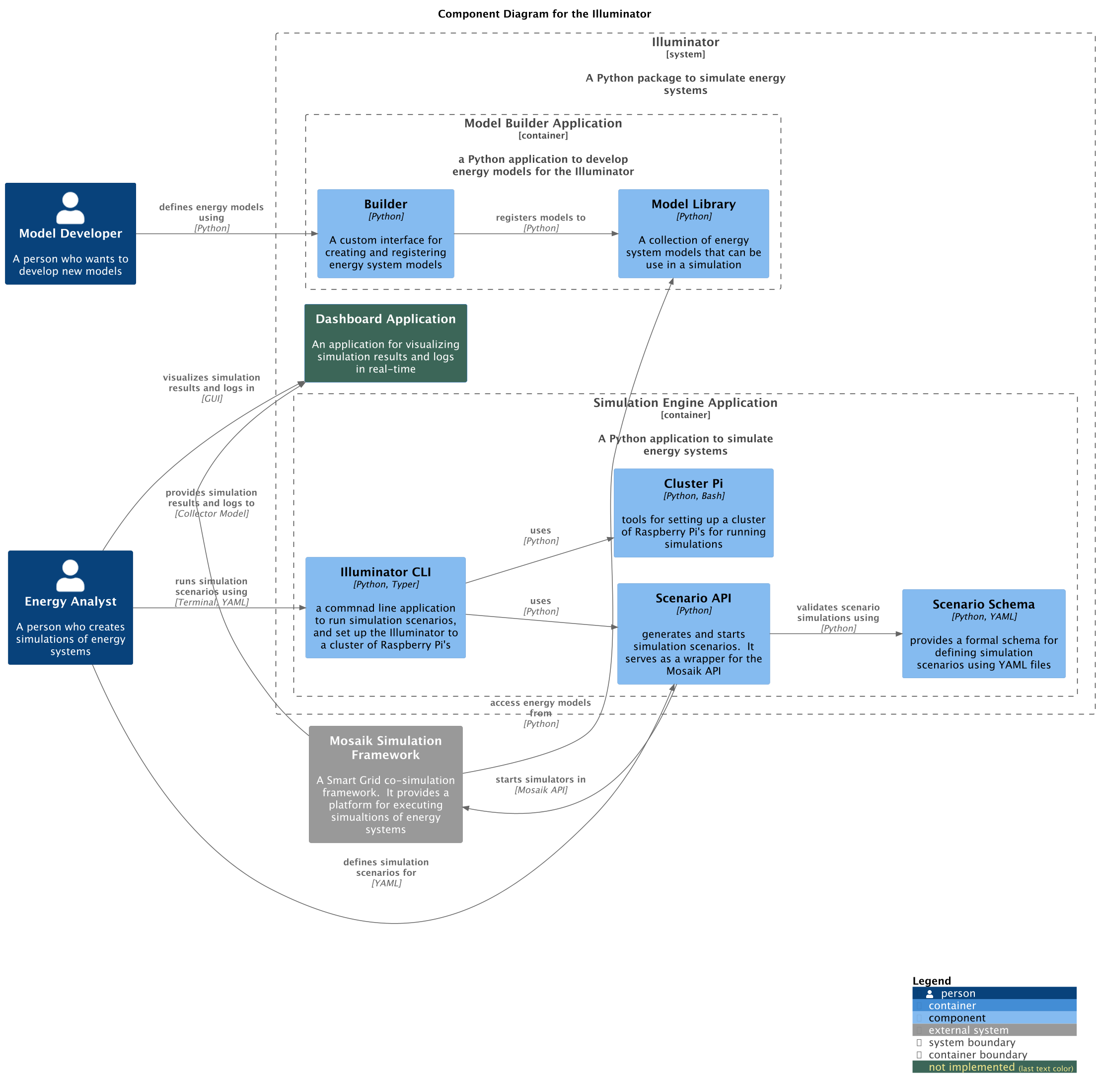 The Illuminator consists of modular Python applications to perform simulations of energy systems. This section provides an overview of its software architecture. The diagram below describes the components of the Illuminator using the terminology of the C4 model.